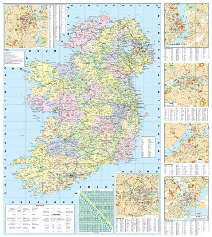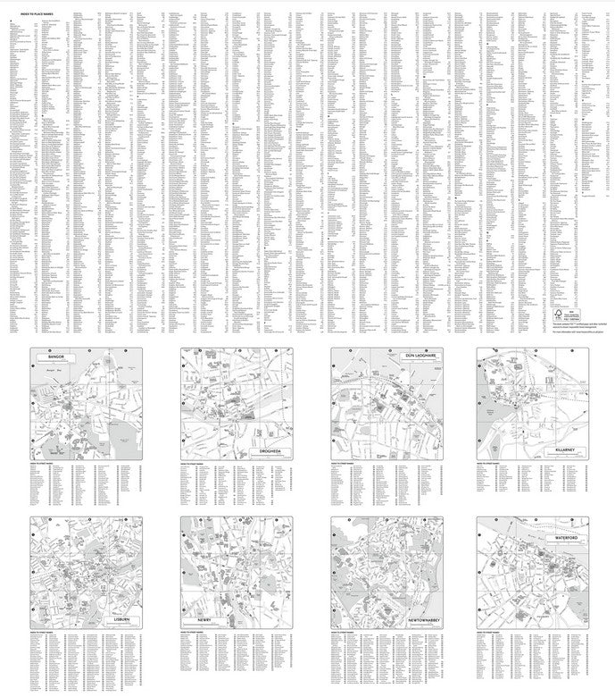 - City/town centre street plans of Belfast, Cork, Dublin, Dún Laoghaire, Galway, Limerick, Londonderry/Derry and Waterford showing places of interest