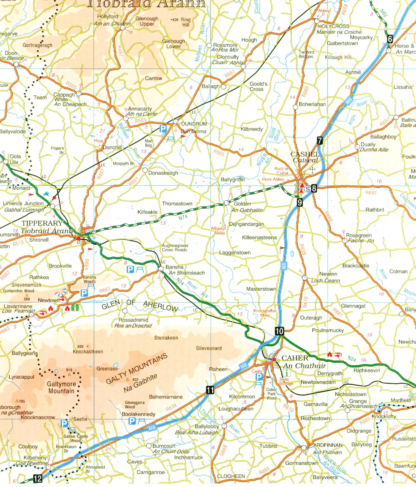 This map displays a wealth of points of interest for the holidaymaker, historian, or day-tripper, too many to fully list here. Key places of historic interest include Blarney Castle, Spike Island, Caher Castle and the Rock of Cashel. This map is particularly useful for exploring the many fishing rivers of Munster.