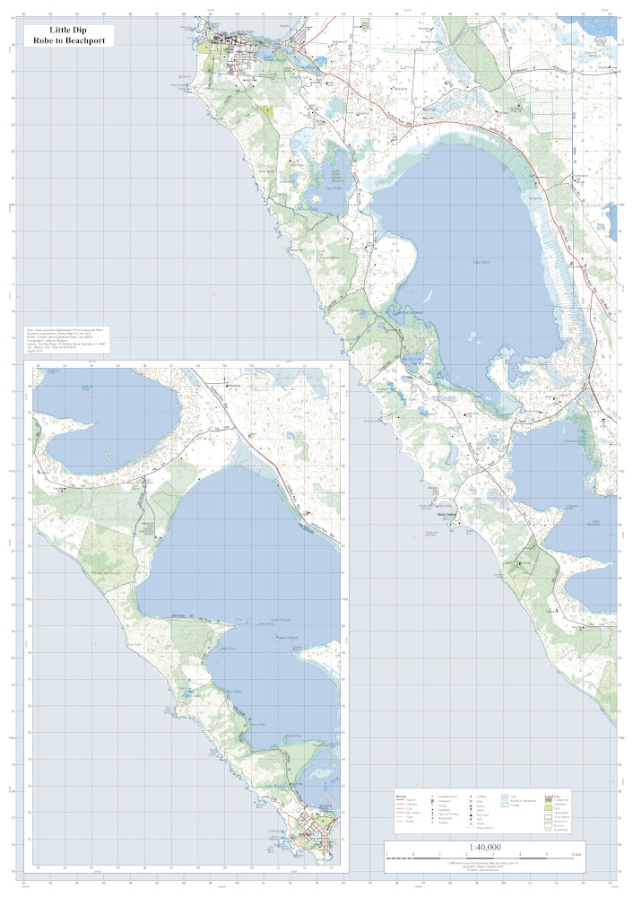 The main map extends from Robe in the NW to Bog Lane in the SE and the inset map starts at Bog Lane in the NW and goes to Beachport in the SE. Includes Lake George, Nora Creina, Lake St Clair, Southern Ports Hwy, Lake Sinclare, Lake St Clair Conservation Park, Lake Robe Game Reserve, Little Dip Conservation Park, Big Dip Lake.