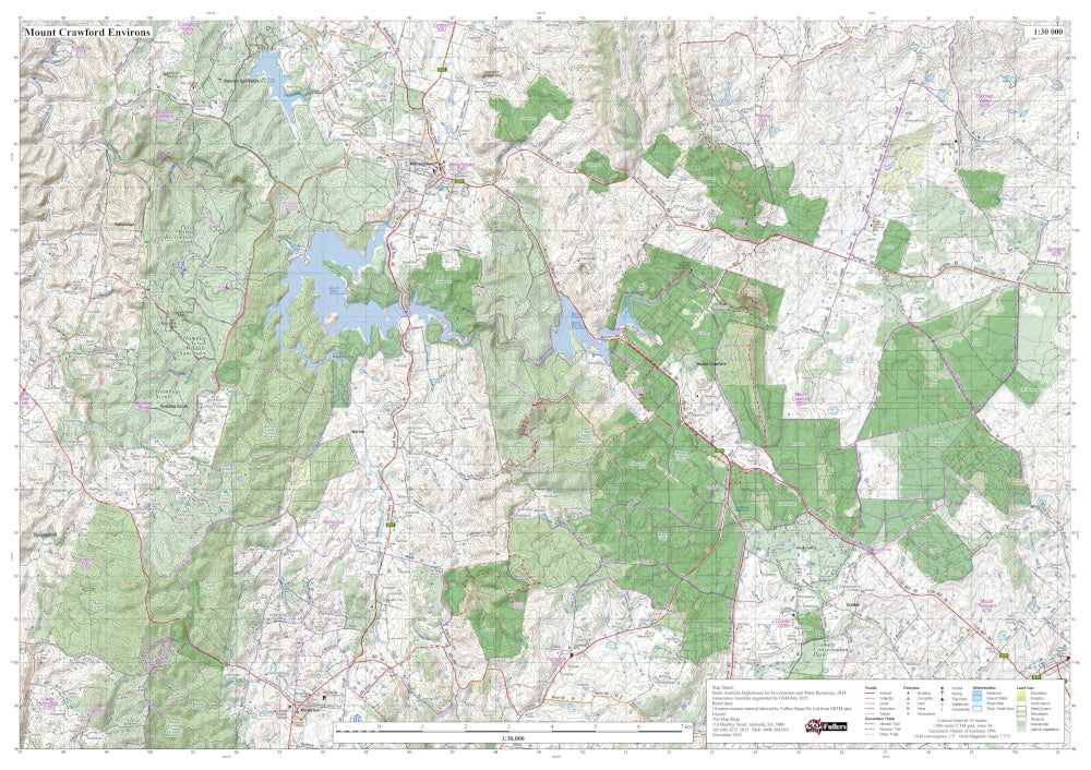 Fullers Maps at The Map Shop now include a print on demand range called the Fullers SA Recreation Series. These maps target popular destinations that South Australians like to visit for hiking and exploring. Each map is A1 in size and displays the topographic detail users want to see. The maps all use the relevant UTM grid and zone with coordinates shown around the outer edge of the map and thin grid lines across the map. Contours with numbered index lines are included on each map along with named topological features such as creeks/streams, hills/mountains, locations etc. There are of course the road and track lines as well.